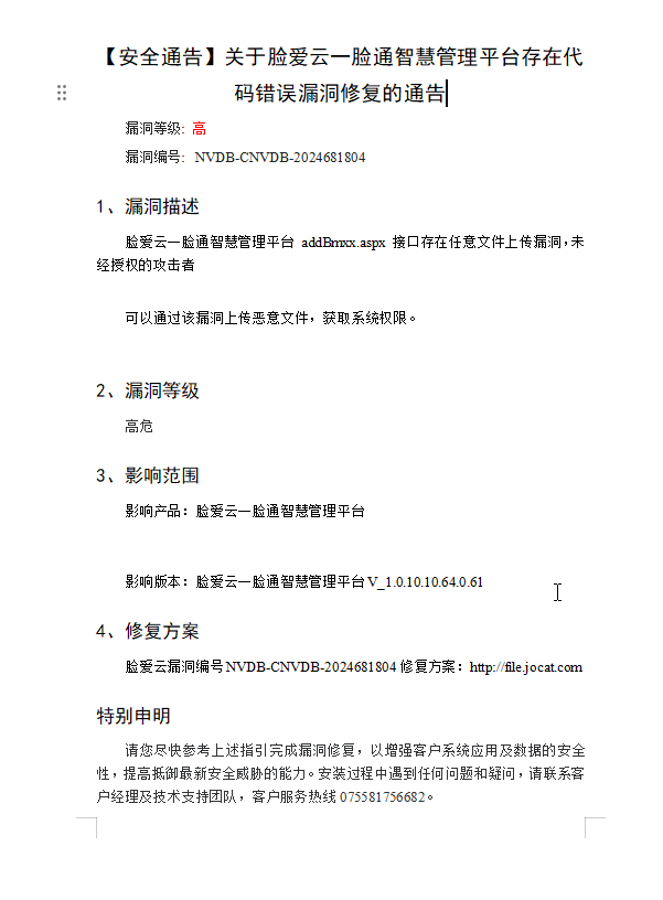 【安全通告】关于脸爱云一脸通智慧管理平台存在代码错误漏洞修复的通告