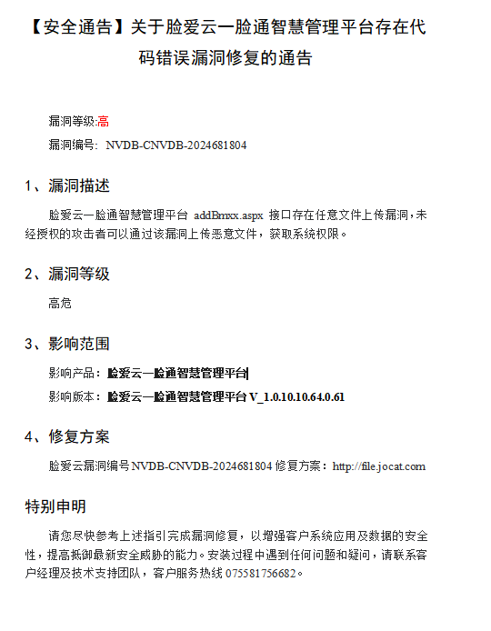【安全通告】关于脸爱云一脸通智慧管理平台存在代码错误漏洞修复的通告